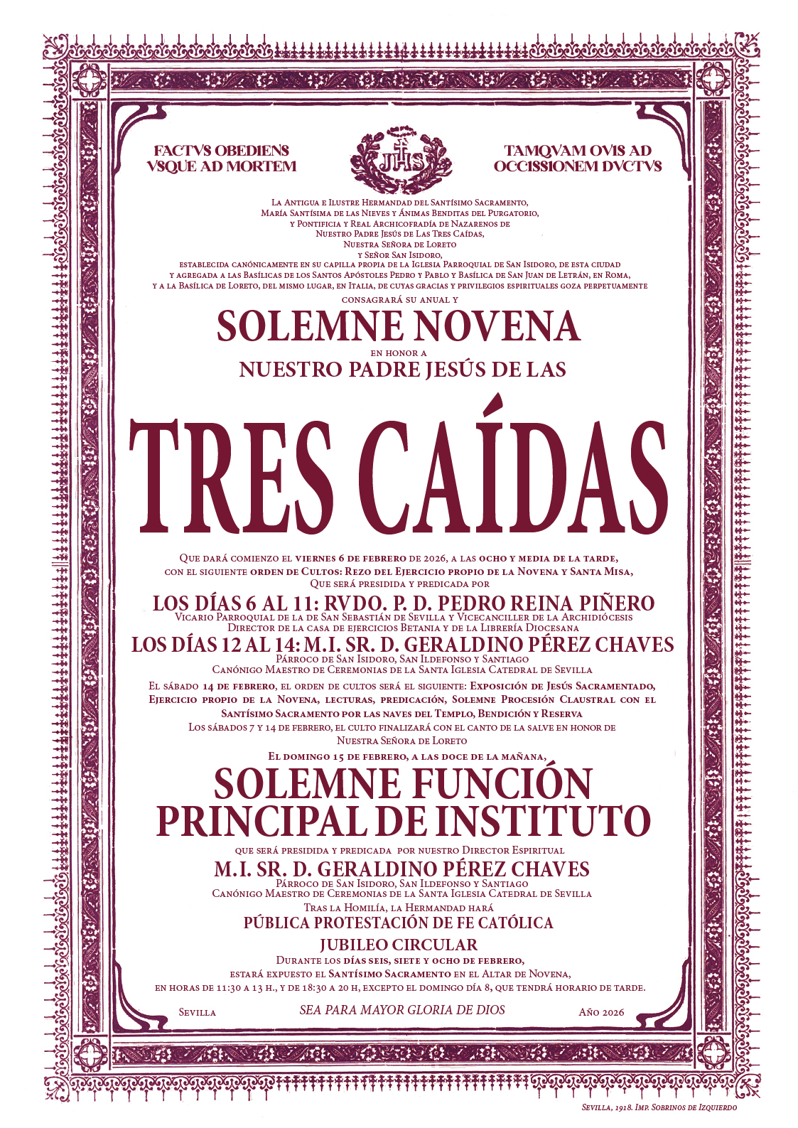 La Novena, dará comienzo el viernes 6 de febrero a las 20:30 horas con el rezo del Ejercicio propio de la Novena y Santa Misa, que será presidida y predicada, los días 6 al 11 de febrero, por D. Pedro Reina Piñero, Vicario Parroquial de San Sebastián y Vicecanciller de la Archidiócesis, Director de la casa de ejercicios Betania y de la Librería Diocesana, y los días 12 al 14 de febrero, por nuestro Director Espiritual, D. Geraldino Pérez Chaves, párroco de San Ildefonso, Santiago y San Isidoro, Maestro de Ceremonias de la Santa Iglesia Catedral de Sevilla.
